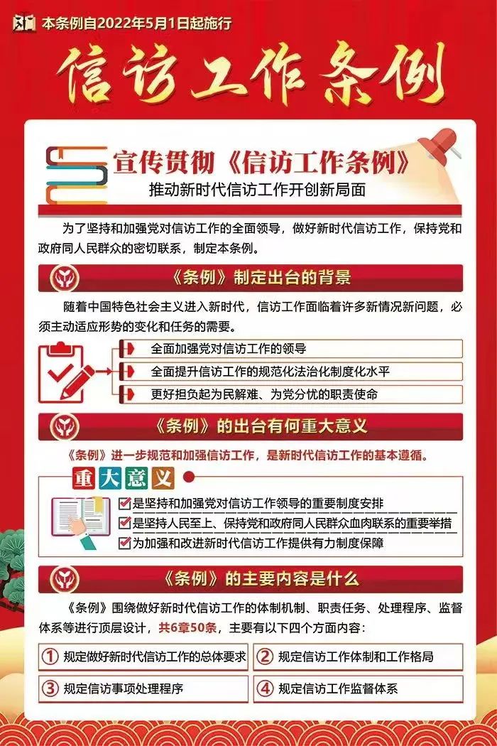 日前,中共中央、國務(wù)院印發(fā)的《信訪工作條例》全文公布,條例共6章50條,自今年5月1日起施行。條例詳盡規(guī)定了信訪工作的各環(huán)節(jié)事項(xiàng),以下亮點(diǎn)值得關(guān)注,一起來學(xué)習(xí)吧!